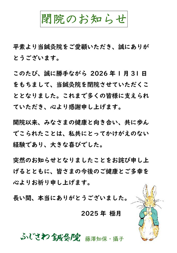 年末年始は、2025年12月31日(水)~ 2026年1月4日(日)まで休診いたします。